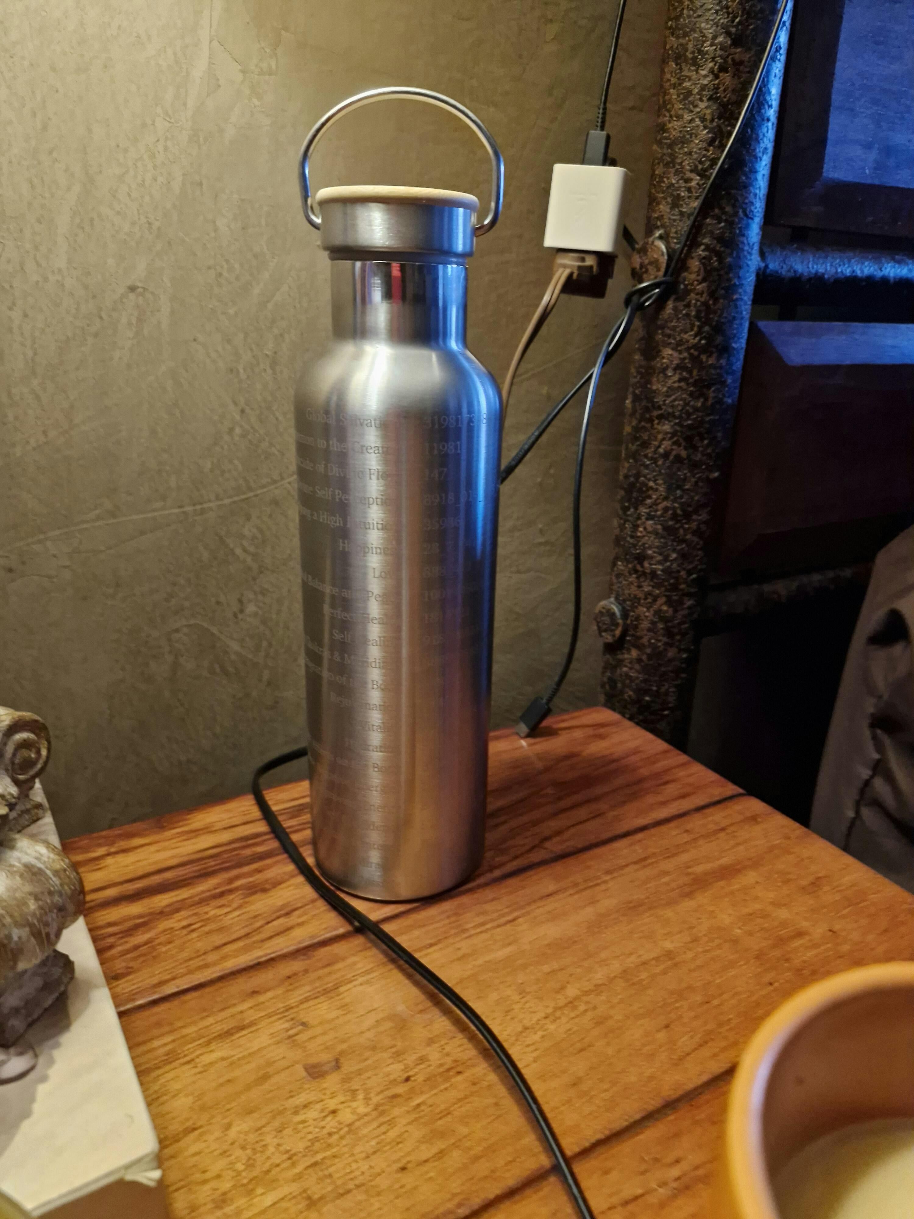 750ml double-walled stainless steel bottle with Grabovoi codes to transform water and align the body with high frequencies.